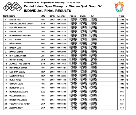 Celie LESNARD, quant à elle, démarre très fort ces qualifications en finissant à la première place de l’escrime avec 15 victoires pour 7 défaites. Elle obtient par la suite le 21e temps en natation (2’35”23) et le 17e temps en Laser Run (12’45”54). Elles finissent toutes les deux avec 1025 points et la qualification en poche.