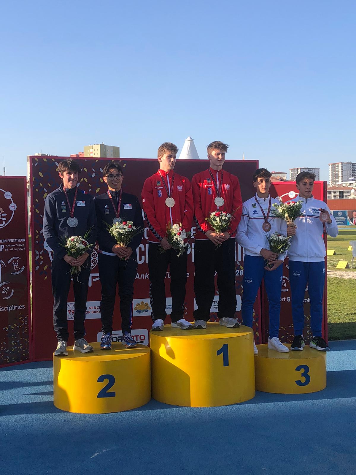 Ils ont gagné l’escrime et le parcours d’obstacles avec 250 points et un temps de 55″11. Les Bleus ont ensuite réalisé le 4e temps de la natation en 2’00″65 et la 7e performance sur le Laser Run en 9’05″86. Cylian Casanovas et Léon Vandenborre ont terminé à 8 secondes des Polonais vainqueurs, les Italiens ont pris la 3e place.