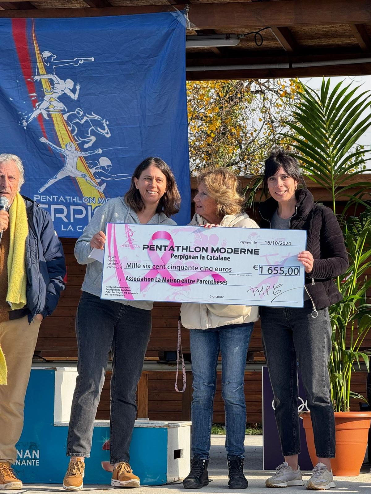 C’est à cette occasion et avec beaucoup d’émotion que le PMPC a remis le chèque du laser-run que le club a organisé dans le cadre d’ ” Octobre Rose “ à Joëlle Estève présidente de l’association ” La maison entre parenthèses “. Cette structure, basée à Perpignan, est un lieu d’échange qui s’adresse à un public féminin, atteint de tout type de cancer.